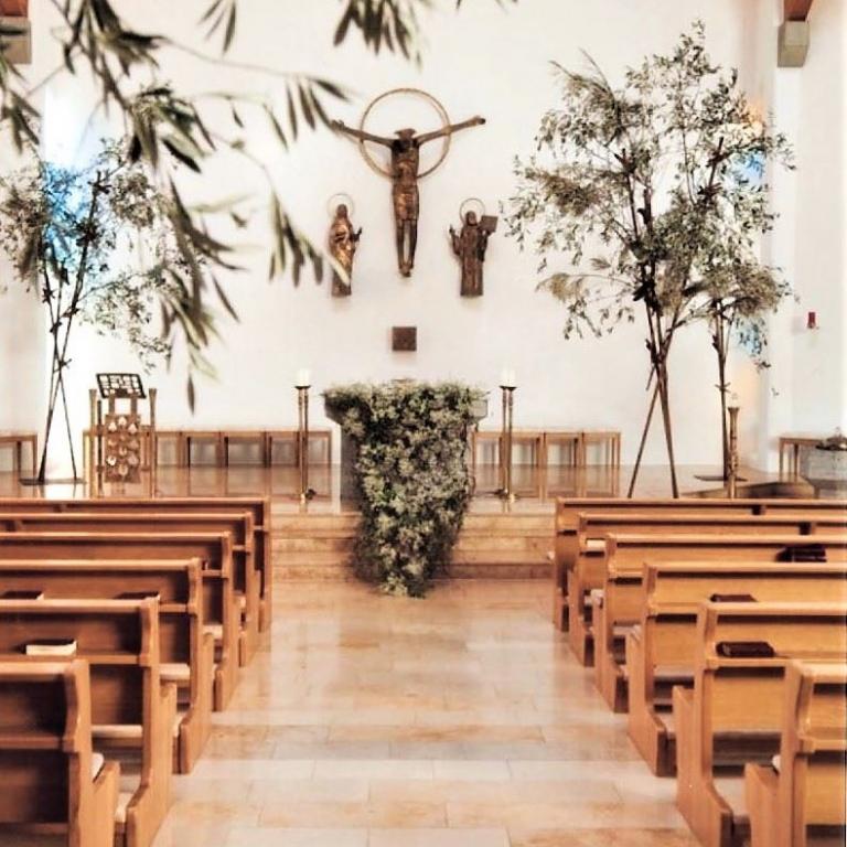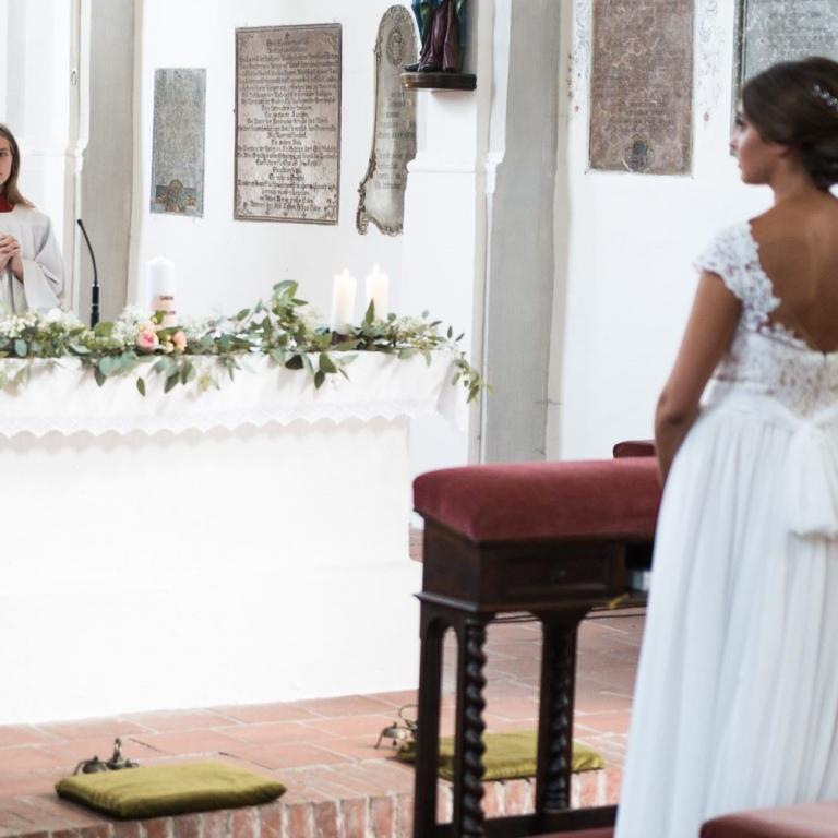 Der Schritt zum Altar – eingefangen, begleitet von Blumen – an den Kirchenbänken, den Brautpaarstühle, am Altar.