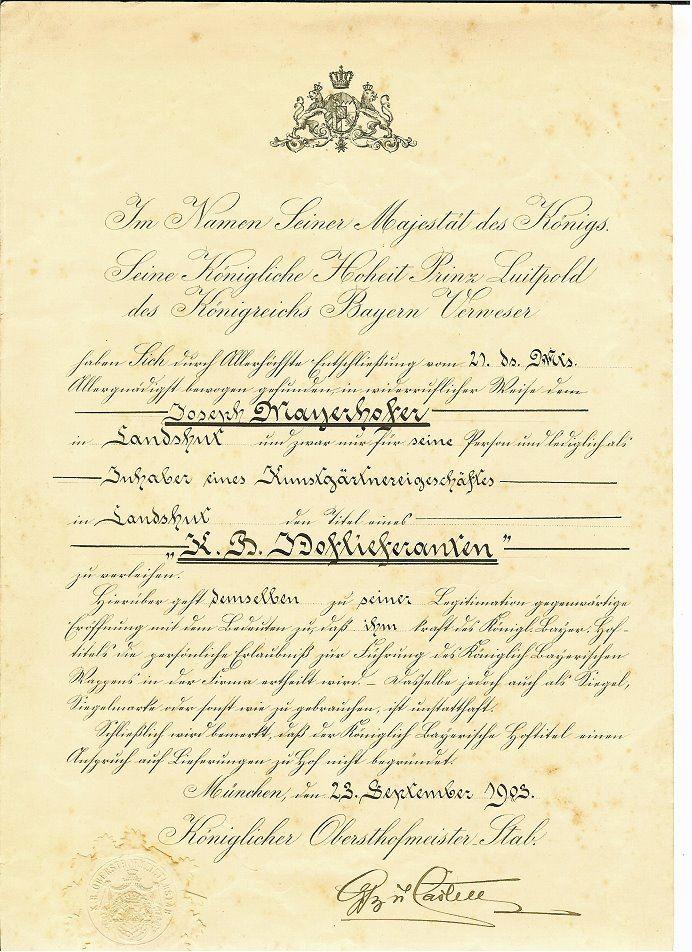 wurde sein Fleiß durch den Erhalt des Titels Königlich Bayerischer Hoflieferant belohnt.