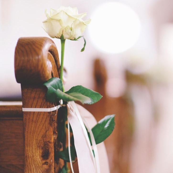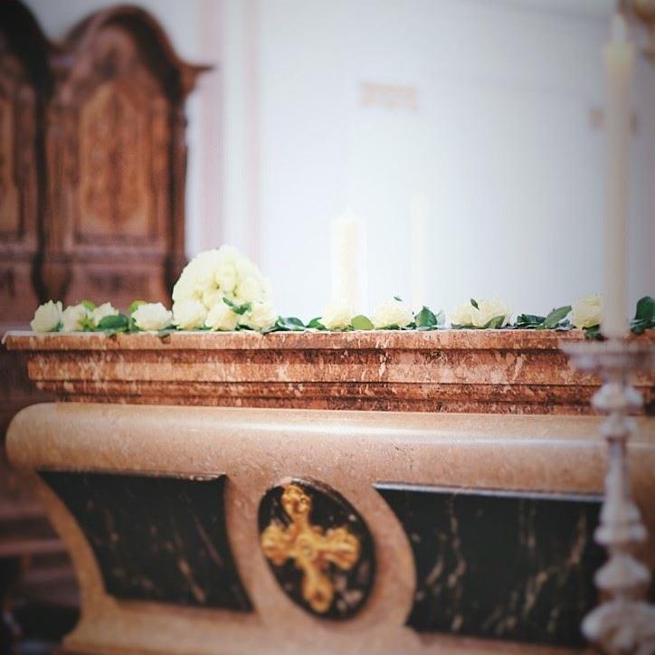 Der Schritt zum Altar – eingefangen, begleitet von Blumen – an den Kirchenbänken, den Brautpaarstühle, am Altar.